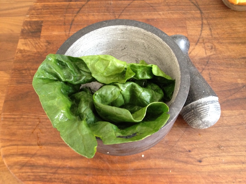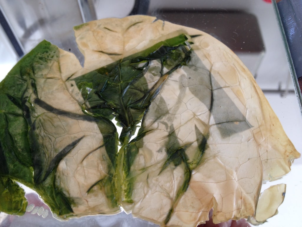 I tried two different leaves. One was my spinach, again. I placed it on a mirror (for lack of more glass plates) and covered it with a glass plate.