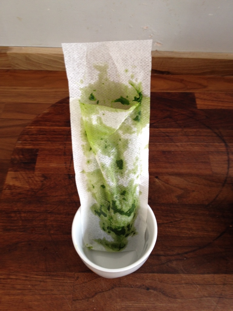 In Anthotypes you basically cover paper (or fabric) in natural plant extracts and expose them as a contact print in the sun. That’s all. No developing, no washing, no fixing, no chemicals. So I rummaged through my vegetable drawer and decided to use up some fresh spinach and some limp raw beetroot. I cut them up and squeezed them with pestle and mortar with a bit of rum (the only higher percentage alcohol I could find). Then I strained them through a tea sieve. Apparently, you could add just water or even oil instead of the alcohol, but I didn’t try that.
