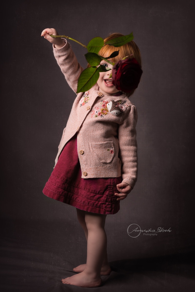 We played a bit in the studio to get her used to it and she really liked out old arm chair. It is actually a bit to small for an adult to sit comfortably but was perfect for her size. And -of course- I just had to give her a rose to hold on to (one without thorns, obviously). It was so sweet how the flower immediately put a big smile on her face. Her mummy had to come again and again to smell it. And in no time at all the rose was used as a wand…